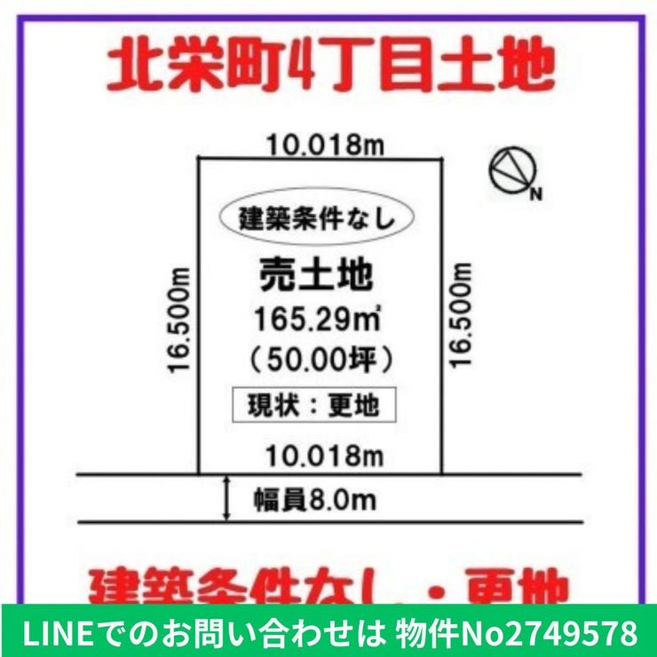 苫小牧市東エリア 北栄町の165.29㎡(50坪)の売土地です。北東側8.0mの公道に10.018m接道された整形地です。前面道路に上下水道管が埋設されている閑静な住宅地です。建築条件はありませんのでお好きな建築メーカー、工務店での建築が可能です。更地で間口10.018mに奥行き16.500mの整形地です。徒歩10分圏内にはコンビニ、ホームセンター、スーパー、バス停がある利便性のよい平坦なところです。