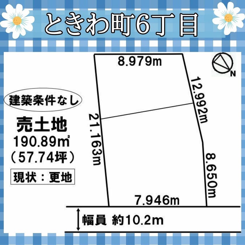 土地面積190.89㎡(57.74坪)東向きで間口は7.94m!! 土地前面の道路は10.2mとなっております。