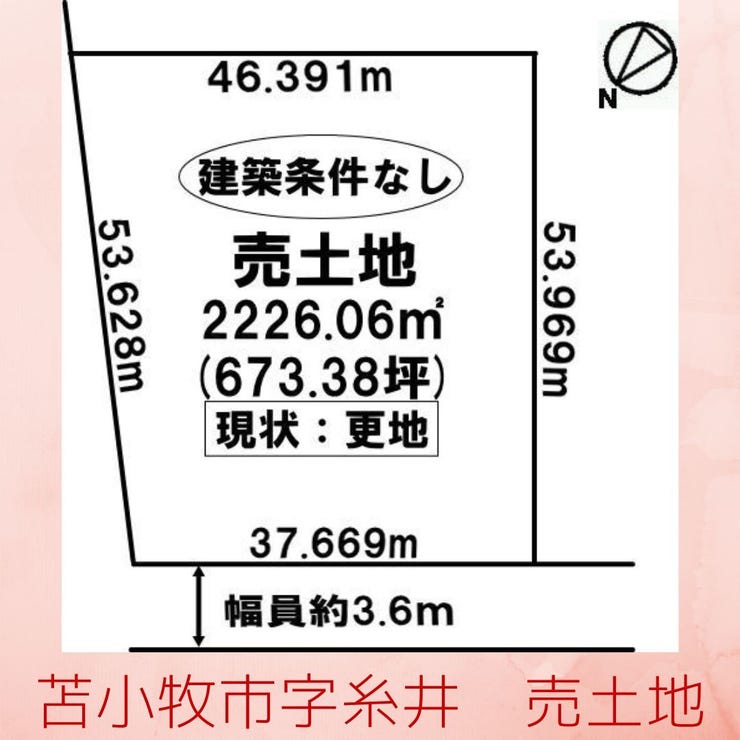 苫小牧市字糸井土地 建築条件無し★土地面積330㎡(99.82坪)西向きで間口は11.57m!! 土地前面の道路は約3.0mとなっております。
