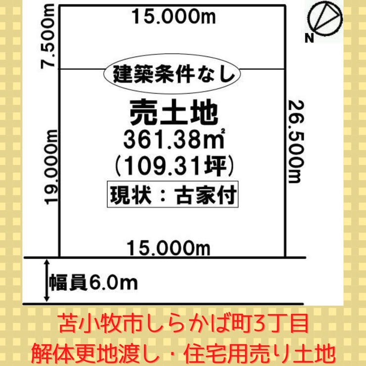土地面積361.38㎡(109.31坪)北西向きで間口は15.00m!! 土地前面の道路は6.0mとなっております。