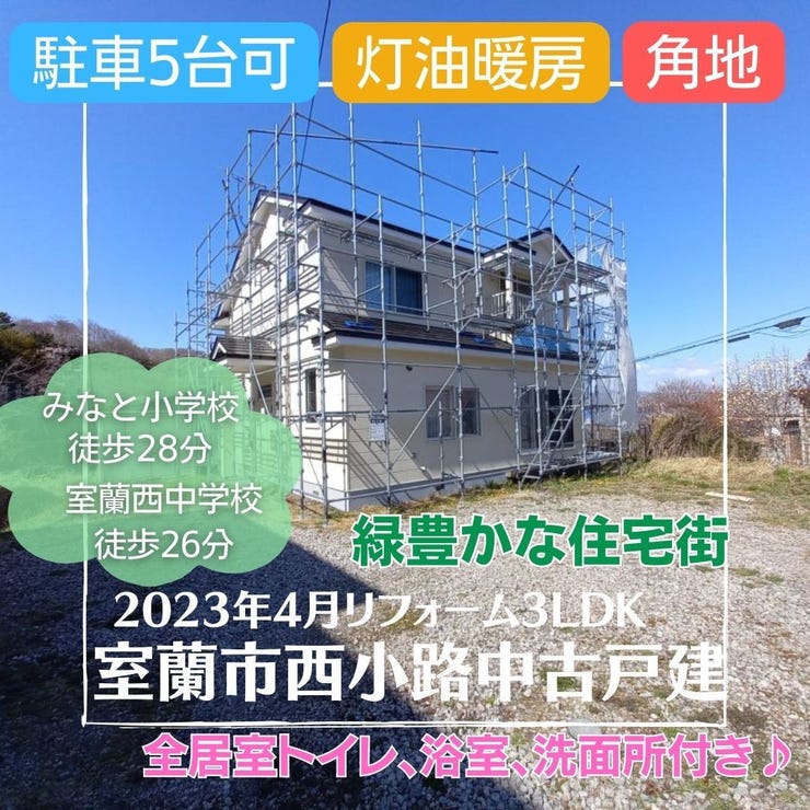 2023年2月内装リフォーム済☆4LDKで駐車は普通車1台可能(軽自動車なら2台)です☆都市ガスで省エネ給湯器☆JR「輪西」駅まで徒歩19分、バス停「潮見公園入口」まで徒歩2分☆