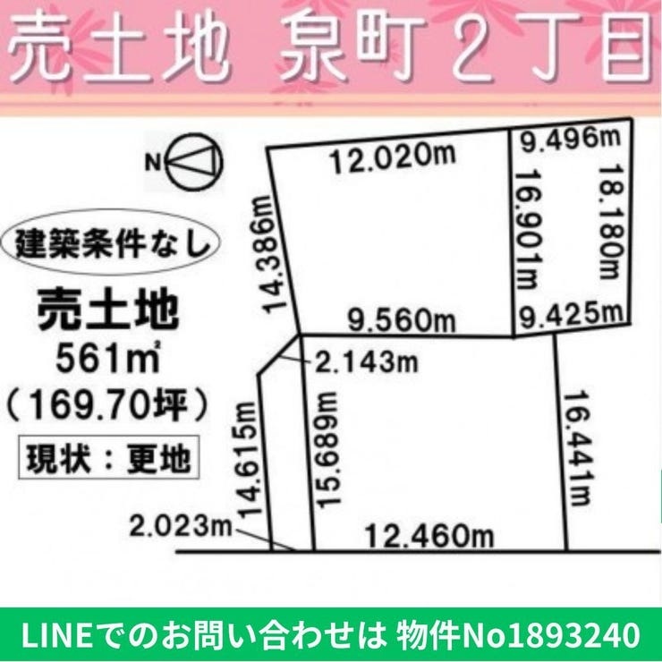 土地面積561㎡(169.70坪)西向きで間口は14.48m!! 土地前面の道路は4.0m以上となっております。