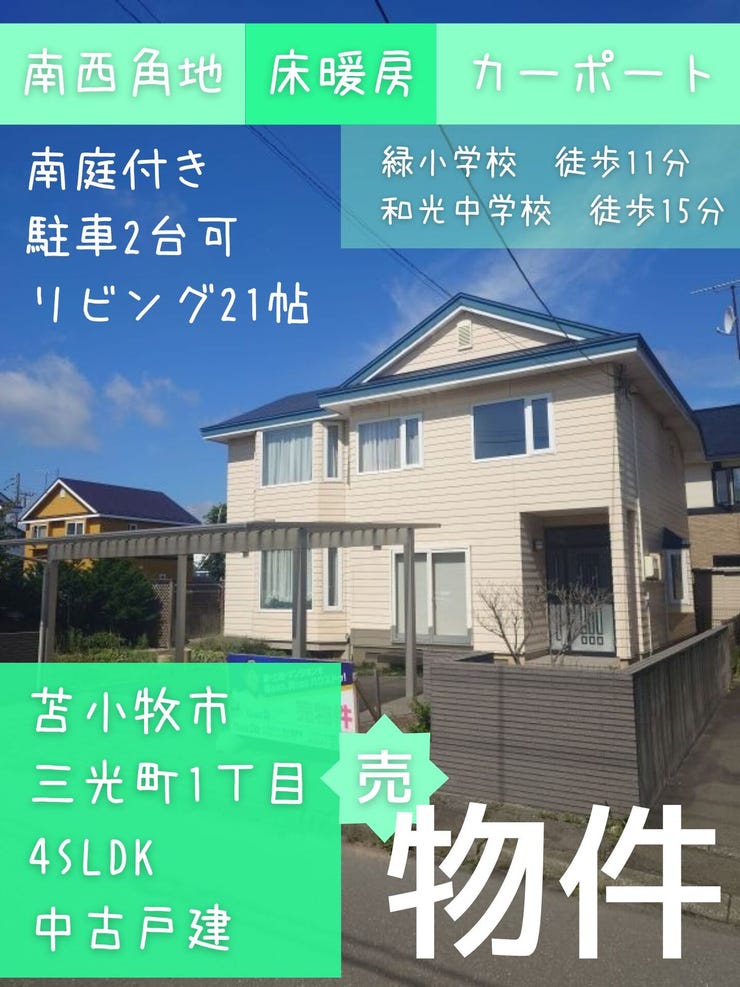 苫小牧市の中央エリア・三光町の閑静な住宅街にある南西角地のオール電化4SLDK中古戸建★JR「苫小牧」駅まで徒歩39分、道南バス「日の出1丁目」停まで徒歩8分★緑小学校:860m、和光中学校:1185m★付近を幹線道路が通っており、車で3分圏内にはコンビニはもちろんスーパー・ホームセンターなどが建ち並んでおります★