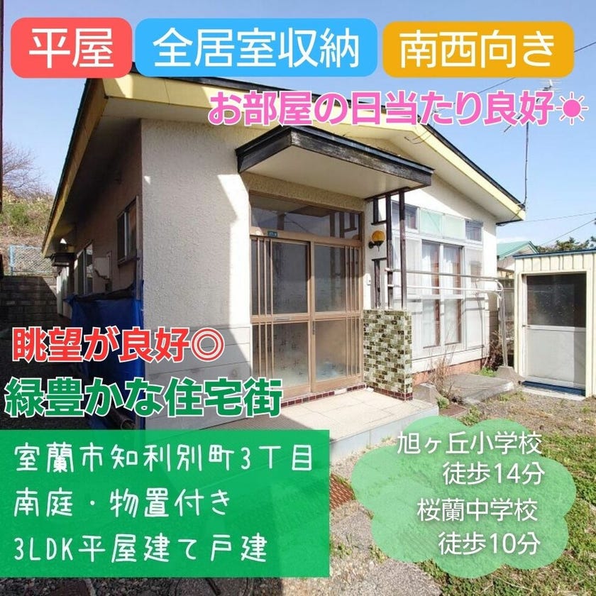 ★住宅ローンの返済例 お借入金額75万円の場合当初固定金利3年・金利0.7%・お借り入れ期間35年・ボーナス払いなし 月々2,013円のお支払い ※その他諸費用発生致します★昭和51年築南西向き平屋建て中古戸建★傾斜地でお家からは東室蘭を一望できます★南西向きの日当たりの良いお庭★全居室に収納スペースあり★灯油ボイラー★