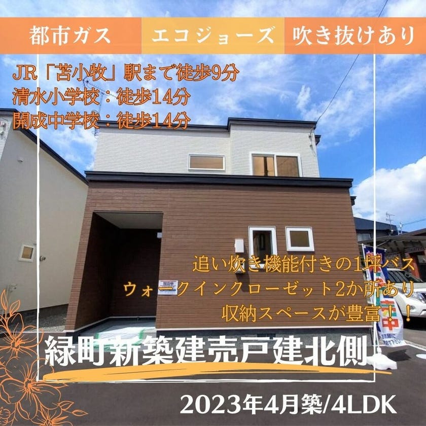 緑町にある2023年4月築・4LDK・新築建売戸建☆駐車は敷地内に約3台収容可能☆都市ガス・エコジョーズ・追焚き機能付き浴室で経済的です☆