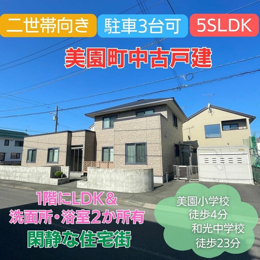 美園町にある2008年4月・ミサワホーム様施工・5SLDK中古戸建☆1階には18帖と14.5帖のLDKの他、洗面所・浴室・トイレも2か所あり二世帯向けです☆駐車はシャッター車庫含め約3台可能☆南西角地で日当たり良好☆2階には約6帖のフリースペースがあります☆