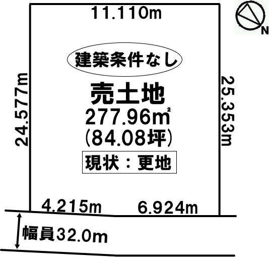 土地面積277.96㎡(84.08坪)北東向きで間口は11.13m!! 土地前面の道路は32.0mとなっております。