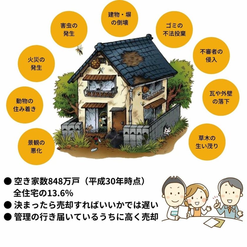 空き家を適切に維持管理せず放置すると、「特定空家」に指定され、過 料が課せられたり行政の指導が入ったりするほか、固定資産税が高くな る。売却することで維持費や税金の負担から解放される。