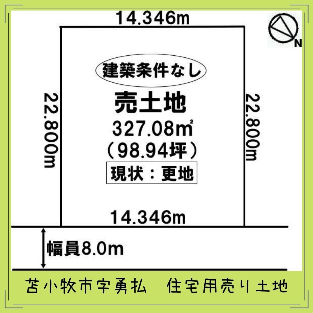 苫小牧市字勇払土地 建築条件無し☆ お好きなハウスメーカー・工務店様で自分の建てたいお家を建築できます♪ 土地面積327.08㎡(98.94坪)北向きで間口は14.3m!! 土地前面の道路...