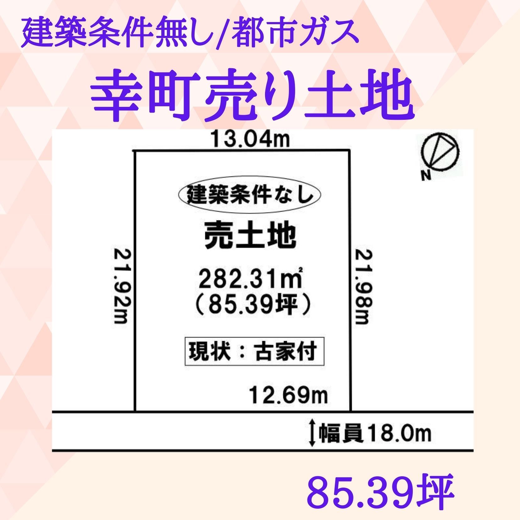 苫小牧市幸町土地 建築条件無し☆ 土地面積282.31㎡(85.39坪)北西向きで間口は12.69m、土地前面の道路は18.0mとなっております。 現在古家付ですが解体更地渡しとなります。...