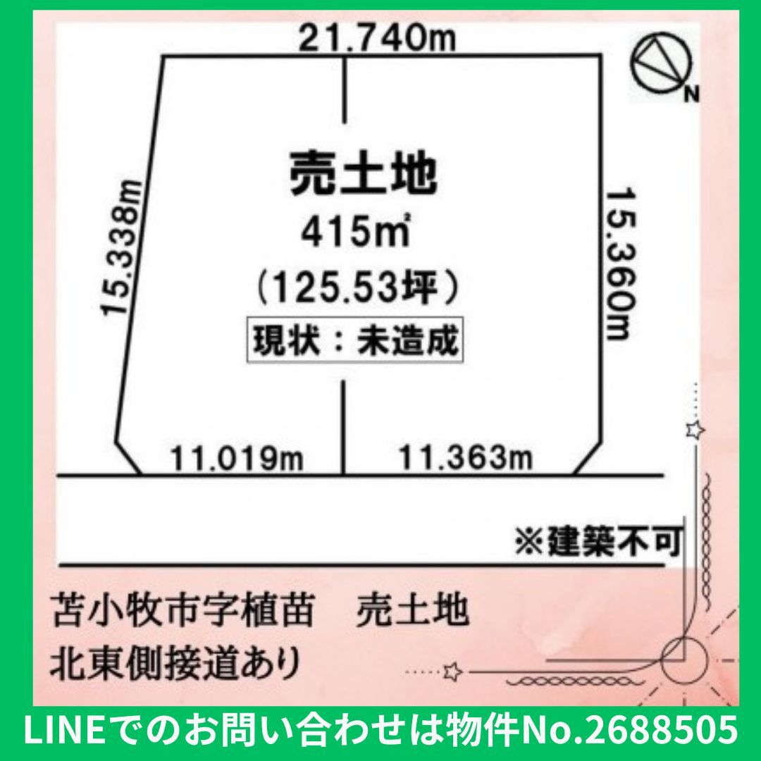 苫小牧市字植苗の広大な緑に囲まれた場所にある自然豊かな125.53坪の北東向き売り土地★ JR「植苗」駅まで徒歩61分、道南バス「ネイチャーセンター入口」停まで徒歩6分★ 付近を幹線道路が...